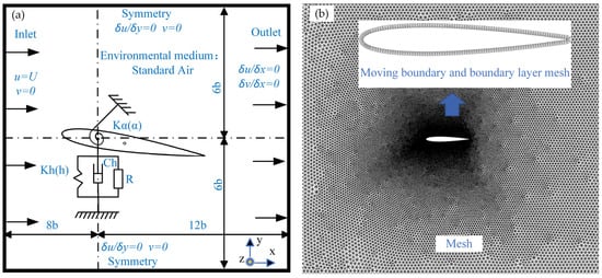 The numerical simulation domain consists of a rectangular region measuring 20b × 12b, as illustrated in Figure 4a. The boundary conditions are configured as follows: velocity inlet at the upstream boundary; pressure outlet at the downstream boundary; symmetric conditions at both upper and lower boundaries; and no-slip wall condition on the airfoil-based surface. To ensure mesh quality and capture flow characteristics accurately, a structured mesh strategy is employed, as shown in Figure 4b. Special attention is paid to the boundary layer region around the airfoil, where mesh refinement is implemented to resolve the near-wall flow physics. To handle the airfoil-based motion and prevent mesh distortion, a dynamic mesh technique is adopted, ensuring that the boundary layer mesh moves synchronously with the airfoil-based surface. The mesh update is performed at each time step according to the displacement calculated through the UDF framework.