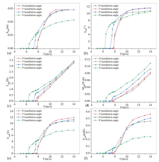 Variation in output characteristics with the installation angle: (a) root mean square displacement; (b) root pitch angle; (c) root mean square output lift; (d) root mean square moment; (e) root mean square output voltage; (f) root mean square output power.