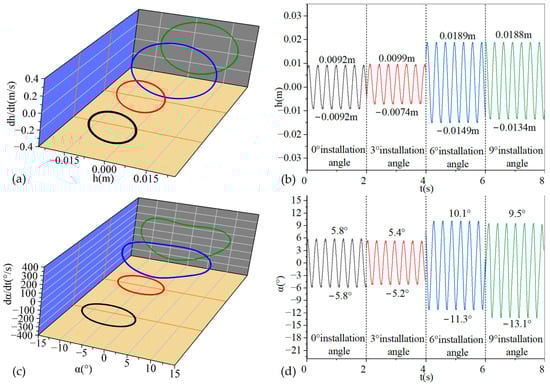 Variation in output characteristics with the installation angle under wind velocity of 8 m/s: (a) phase diagram of displacement; (b) time history of displacement; (c) phase diagram of pitch angle; and (d) time history of pitch angle.