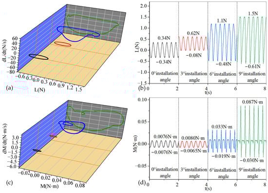 Variation in output characteristics with the installation angle under wind velocity of 8 m/s: (a) phase diagram of lift; (b) time history of lift; (c) phase diagram of moment; and (d) time history of moment.