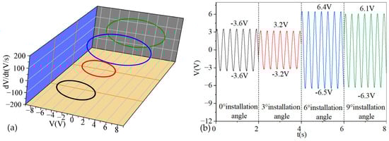 Variation in output characteristics with the installation angle under wind velocity of 8 m/s: (a) phase diagram of output voltage; (b) time history of lift.