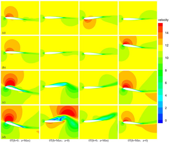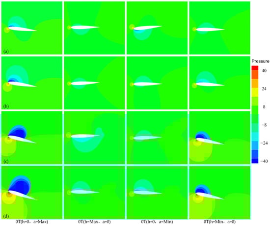 To further investigate the aerodynamic mechanism and elucidate the phenomena observed in Section 3.2, a comprehensive comparative analysis was conducted on the flow characteristics of the airfoil-based flutter piezoelectric energy harvester system under a constant incoming flow velocity of 8 m/s. Figure 9 and Figure 10 illustrate the pressure distributions and velocity profiles under four mounting angles during one vibration cycle.