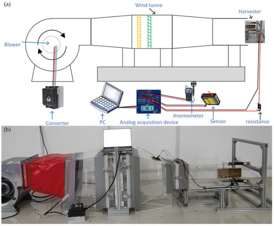 Wind tunnel experimental setup: (a) schematic diagram; (b) physical device.