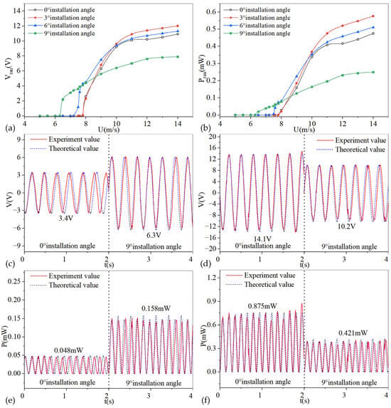 Output performance of the harvester system with and without installation angle obtained theoretically and experimentally: (a) output voltage versus airflow velocity; (b) output power versus airflow velocity; (c) time history of the output voltage at 8 m/s; (d) time history of the output voltage at 11 m/s; (e) time history of the output power at 8 m/s; (f) time history of the output power at 11 m/s.