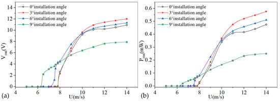 Experimental results of output characteristics changing with installation angle: (a) output voltage versus airflow velocity; (b) output power versus airflow velocity.