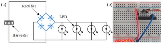 To validate the energy harvesting capabilities of the airfoil-based flutter energy harvester system and to pave the way for its practical application, an energy harvesting circuit was meticulously designed, and experiments were conducted. The energy harvesting circuit, as illustrated in Figure 14, consists of a rectifier and a light-emitting diode (LED). The current generated by the airfoil-based flutter energy harvester system is rectified by the rectifier and subsequently utilized to power the LED. In Figure 14b, an experimental image showcases the airfoil-based flutter energy harvester system successfully powering six LED lamps at a velocity of 11 m/s. This demonstration serves as concrete evidence of the feasibility and functionality of the airfoil-based flutter energy harvester system, indicating its potential for practical applications in the future.