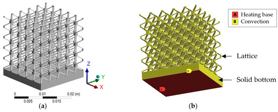 A constant heat flux is introduced from the lower face of the bottom plate and convection losses are considered in all faces of the lattice structure; see Figure 1b. The model considers temperature-dependent properties, which are experimentally measured as indicated in Section 2.1.