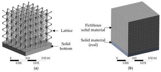 In the numerical simulations, unstructured tetrahedral meshes are generated for the lattice structures—see Figure 2a—whereas, for the solid block, hexahedral elements are selected—see Figure 2b. For both geometry types, a mesh independency study was carried out prior to the simulations to ensure the convergence and, thus, the validity of the results.