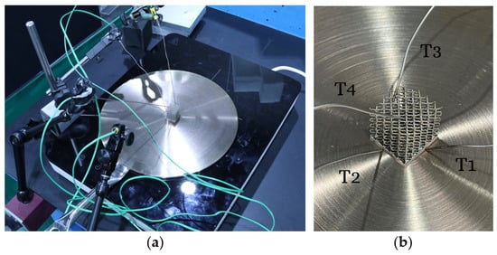 (a) Experimental setup for the lattice heating and (b) positioning of the four thermocouples employed to monitor the heating cycle: two on the base (T1 and T2) and two on the upper face (T3 and T4).