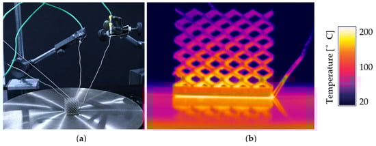 During the tests, a 22 °C constant room temperature is measured, which is also the initial temperature for the heating tests. In the air surrounding the lattice structure, there is no external ventilation or airflow, which ensures that the only heat dissipation mechanism of the lattice is natural convection. Moreover, the heating tests are monitored through an Optris PI thermal camera (Optris GmbH, Berlin, Germany), whose emissivity is adjusted with discrete thermocouple measurements; see Figure 4. In this way, the full thermal field of the lattice is defined.