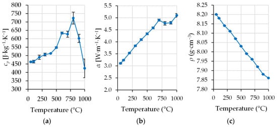 Thermal properties of Inconel 718: (a) specific heat, (b) thermal diffusivity, and (c) density.