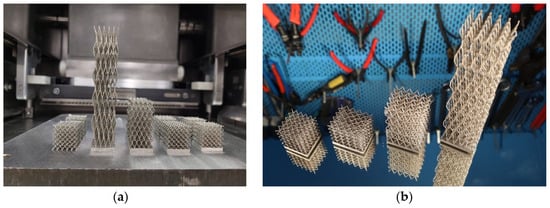 The lattice structures are printed on a solid base that is approximately 3.5 mm thick, which is directly attached to the metal printing platform to mitigate any thermal deformation during the printing process; see Figure 6a. This support prevents warping and ensures the structural integrity of the printed components. After fabrication, the printed pieces are detached from the base using wire EDM, leaving a residual solid base of 2.00 mm beneath the lattice geometries.