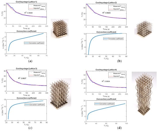 The cooling stage takes 300 s, which ensures that the sample is cooled down to room temperature, 22 °C, and, during this process, the temperature of the sample is continuously monitored. In this condition, the cooling process is controlled by Equation (2), where mlattice is the mass of the lattice [kg], cp is the specific heat [J·kg−1·K−1], T is the temperature of the lattice measured by the thermocouple [°C], h is the convection coefficient [W·m−2·K−1], Alattice is the area of the lattice in contact with the air [m2], and Troom is the room temperature [°C], which is monitored by a thermocouple positioned close to the lattice structure. This equation allows us to obtain a temperature-dependent convection coefficient as a function of the lattice temperature; see Equation (3). The lattice mass and area values are provided in Table 4.