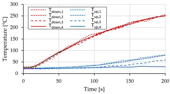 Based on the experimental setup depicted in Section 2.2.2, the evolution of the temperatures on the upper and lower faces of the lattice structures is measured; see Figure 8. In each lattice structure, the lower temperature, Tdown, is the average of the two thermocouples situated in the face in contact with the heated steel plate (T1 and T2), whereas the upper temperature, Tup, is the average of the two thermocouples situated in this plane (T3 and T4). In Figure 8, the numbers next to the measured temperatures indicate the tested lattice number.