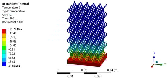 In the simulation of the lattice structures, the real properties of the Inconel 718 measured experimentally in Section 3.1 are introduced into the numerical thermal model. Moreover, the convection coefficient calculated in Section 3.3.1 is included as a function of the face temperature, and the baseplate temperature is imposed to match the real heating produced by the inductor hub. In Figure 9, the thermal field of lattice 3 is shown as an example.