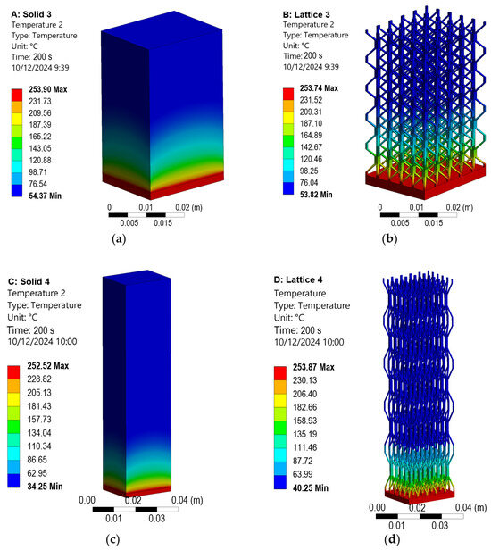 Comparison between the thermal results in case 3 at t = 200 s time step ((a) solid block and (b) lattice structure) and case 4 at t = 200 s time step ((c) solid block and (d) lattice structure).