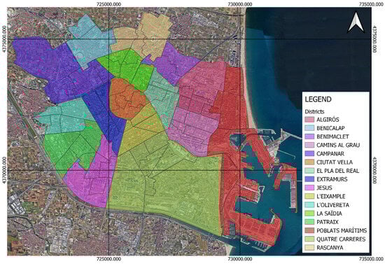 The methodology developed in this article has been applied in two different areas. The first is the city of Valencia, located in the Autonomous Valencian Community, in eastern Spain. This city is made up of 19 districts, which in turn are divided into 88 neighbourhoods [14]. It is the third largest city in Spain and the 24th most populated municipality in the European Union, with 738,669 inhabitants only at city level [15]. The methodology will be applied in the central city of Valencia (Figure 1).