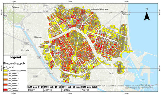Bike renting access population. The bike renting service access in Valencia city is 99.86% (737,593 inhabitants) of the total population. It is the second most accessible mobility service. This is due to the presence of many stations distributed throughout the study area. The only area of the city without access to this mode of transport within 5 min is in the south, near the port. There are 100,869 inhabitants aged between 0 and 14, 493,539 inhabitants aged between 15 and 65, and 143,185 inhabitants aged over 66 who have better access to this service. The distribution of this result can be seen in Figure 4.