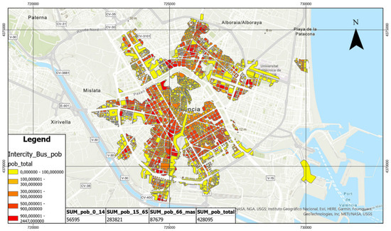 Intercity bus access population. The intercity bus service access in Valencia is 57.96% (428,095 inhabitants) of the total population, which indicates that more than half of the population has a stop of this mobility service less than 5 min from their residence. This service is intended to connect the city of Valencia with the municipalities of the peri-urban area, which is why greater accessibility is observed at the entrances and exits of the city (Figure 6). There are 56,595 residents aged 0–14 years, 283,821 residents aged 15–65 years, and 87,679 residents aged over 66 years with an accessible stop less than 5 min away.