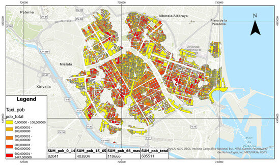 Taxi access population. The taxi service access in Valencia is 81.97% (605,511 inhabitants) of total population. It is the third most accessible mobility service in the city due to the number of stops distributed throughout the study area. Figure 8 shows that residents in the city centre have greater accessibility than those living on the edge of the city, with the southeast area having no accessibility at all. The accessible population broken down by age is as follows: 82,041 residents aged 0–14 years, 403,804 residents aged 15–65 years, and 119,666 residents aged 66 years and over.