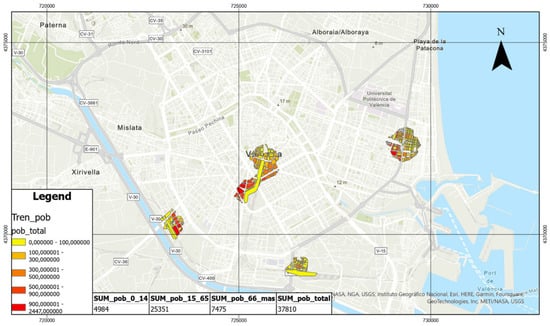 Train access population. The train service access in Valencia is 5.12% (37,810 inhabitants) of the total population. Due to the few stations in the study area, it is the most inaccessible mobility service in the city. The population with the greatest access to this transport lives around the four available stops, as shown in Figure 10. Disaggregated by age, 4984 residents aged 0 to 14, 25,351 residents aged 15 to 65, and 7475 residents aged 66 and over have the greatest accessibility.