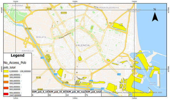 Global. The global access to mobility services in Valencia is 99.98% (738,521 inhabitants) of the total population, indicating that almost all city citizens have access to at least one of the transport services mentioned above (Figure 11). Thus, the population without access to mobility services in Valencia is 0.02% (71 inhabitants). This population is generally concentrated in the southern part of the city, as shown in Figure 12. There are six citizens aged 0–14, 52 aged 15–65, and 13 aged 66 and over.