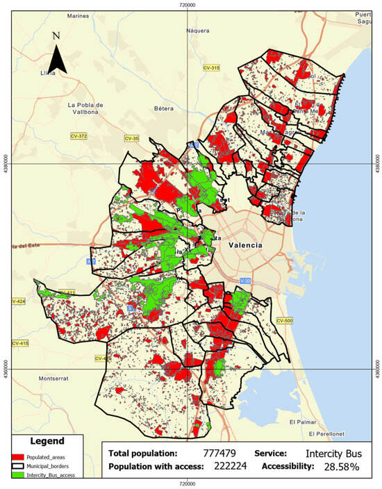 In the case of the peri-urban area of Valencia, we proceed in the same way to calculate the service areas, but this time we only calculate them for urban bus (EMT), intercity bus, metro, train and global. The service areas obtained are intersected with the population areas of the municipalities located in the peri-urban area with the QGIS tool “Intersection” [24]. Sums of the inhabitants within the service areas are obtained for each of the mobility services and the corresponding thematic maps are calculated.