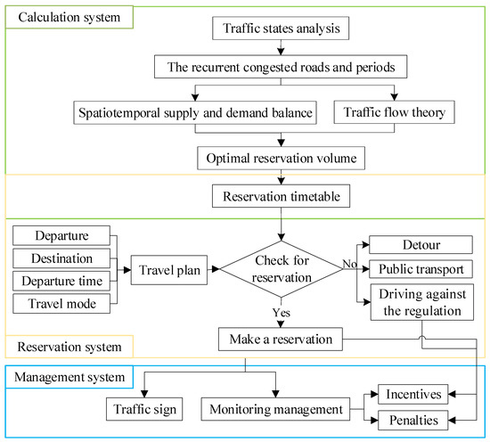 As a novel TDM strategy, the implementation mechanism of the TRS is shown in Figure 1. By mandatorily allocating the total travel volume on extremely congested urban roads, such as expressways or major commuter corridors during specific peak hours, the number of vehicles allowed on these roads is regulated. Travelers can reserve their routes and timeslots in advance on a public reservation platform. Integrating technology and management strategies, TRS meticulously modulates the spatial–temporal right-of-way of vehicles. It aims to alleviate the discrepancies between traffic supply and demand, maximize the utility of road resources, and thereby enhance the overall efficiency of the transportation system. It can significantly reduce urban traffic congestion, optimize the urban ecological environment, and enhance the satisfaction associated with citizens’ commuting experiences. Notably, TRS aligns well with current concepts of Intelligent Transportation and Mobility-as-a-Service (MaaS), underscoring its significant value and broad potential in future urban traffic management. To some extent, TRS embodies a “push” strategy, aspiring to attenuate or redistribute peak traffic volume via the imposition of restrictive conditions, thus alleviating congestion. This approach shares its foundational principles with other “push” strategies, which sway commuters’ decisions through restrictive or penal measures. Nevertheless, owing to the absence of supplementary travel costs, TRS garners superior public endorsement compared to alternative “push” strategies. Using Kim and Kang’s study as an example, they surveyed the public acceptance of a reservation system implemented on highways during holidays [27]. The results showed that over 80% of respondents were willing to adjust their departure times to reduce highway congestion during holidays. This reflects that TRS is more likely to gain public support and participation. Despite the promising outcomes of these studies, the cost and economic viability of TRS mechanisms remain largely underexplored. Implementing TRS requires substantial investments in infrastructure, data collection, and system management. Moreover, there are costs related to incentives and penalties, which must be balanced against the benefits of reduced congestion and improved travel time reliability. Some studies have begun to address this gap, considering factors such as public transportation fare revenues, penalties for non-compliance, and subsidies for system participants. A cost–benefit analysis of TRS would be valuable for understanding its economic feasibility, particularly when evaluating the long-term sustainability of such systems in urban settings.