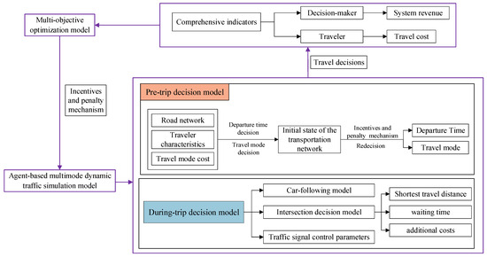 The lower-level model utilizes an ABM to simulate the decision-making processes of individual travelers under various incentive and penalty mechanisms. As ABM operates as a multi-mode dynamic traffic assignment simulation model, its objective function differs from traditional deterministic functions. Hence, this section elucidates the specific decision models affecting the simulation results, including pre-trip and during-trip decision-making models. The model utilizes an ABM to simulate the decision-making processes of individual travelers under various incentive and penalty mechanisms. As ABM operates as a multi-mode dynamic traffic assignment simulation model, its objective function differs from traditional deterministic functions. Hence, this section elucidates the specific decision models affecting the simulation results, including pre-trip and during-trip decision-making models.