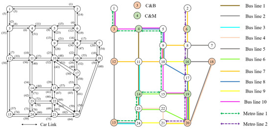 The discrete coefficients to are all set at 0.8, and the weighting factors and are set at 0.6 and 0.4, respectively. The standard fare for buses is uniformly priced at 2 yuan (Yuan is Chinese currency), while the fares for metro lines are detailed in Table 7. is set at 0.5 (yuan/km). is set at 10 yuan. The car traffic capacity of each road is considered as the total reservation volume for that road. Reservations are made in 10 min time windows, and travelers are assumed to accept a maximum time variation of three time windows, which equates to either advancing or delaying their travel by 30 min.