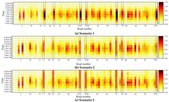 Figure 4 presents heat maps of the saturation of each road in different scenarios. As shown in Figure 4a, in Scenario 1, roads 17, 22, 36, 39, 55, 58, and 76 all had average saturation levels exceeding 0.8, indicating significant traffic pressure and severe congestion, especially on road 55, where the average saturation level reached 1.53, marking it as an area of extreme congestion. Therefore, the implementation of the TRS was considered for these roads.