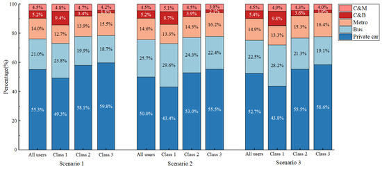 Moreover, following the introduction of the incentive and penalty mechanism, there was an increase in private car usage and a decrease in public transportation (buses and metro) usage in Scenario 3 compared to Scenario 2. This indicates that the incentive mechanism somewhat reduced the economic advantage of public transport by lowering the relative cost of private car travel. The sensitivity to the subsidy mechanism varied among users with different time values. In user classes 1, 2, and 3, the proportion of private car travel increased by 0.4%, 2.6%, and 3.0%, respectively, while public transport usage decreased by 1.4%, 2.1%, and 3.0%. Users with a high time value prioritize convenience and comfort in their travel. They perceive the ability to reserve travel times in advance or adjust their schedules as more valuable than waiting in congestion, and reserved travel provides a more predictable and stable travel experience. Consequently, these users tend to favor private car usage, as it offers more personal space and flexibility, which are particularly important for those who highly value their time. Thus, even with subsidies, they may still prefer private cars. Conversely, users with a lower time value may be more influenced by cost incentives and lean towards choosing lower-cost public transportation. For those with medium (class 2) and lower (class 1) time values, travel mode choices are likely more influenced by cost–benefit considerations. Therefore, introducing the incentive mechanism might encourage more users in these categories to choose private cars, especially when the subsidies significantly reduce the relative costs of car travel.