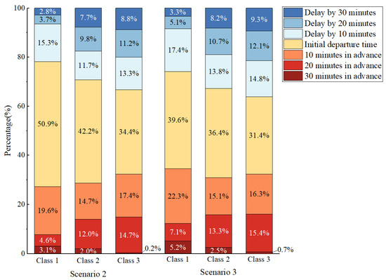 This paper further analyzes the proportion of users choosing reserved travel and the changes in their travel time decisions. In Scenario 2, only 5916 users opted for reserved travel, whereas in Scenario 3, the number increased to 8784 users, a growth of 48.5%. This significant increase indicates that users’ willingness to adopt the reserved travel mode intensifies under incentive and penalty mechanisms. By reducing the cost of reserved travel, the incentive mechanism enhances its appeal. This finding is consistent with previous survey results, suggesting a positive response from users to economic incentives, showing their readiness to adjust travel habits for financial benefits [53].