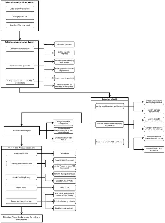 The research methodology comprises several distinct phases aimed at systematically analyzing AEB systems in terms of architecture, security, and threat assessment. The workflow, illustrated in Figure 1, delineates the steps followed in this study.