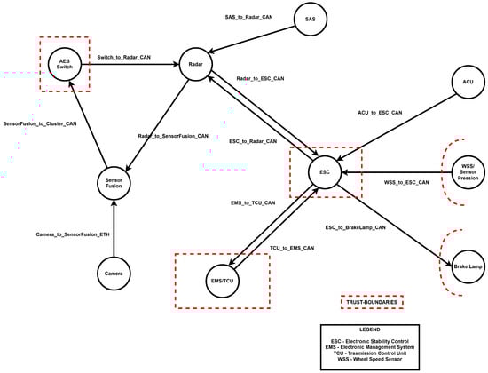 The diagram depicted in Figure 2 illustrates the high-level architecture of the AEB system. In this context, we meticulously addressed and managed all identified threats associated with the components within the system. The architecture includes a comprehensive overview of the AEB components and their interactions, ensuring a thorough assessment of potential vulnerabilities. Additionally, the tool used in our analysis allowed for the identification and evaluation of potential threats specific to each component in the architecture. By systematically setting and analyzing these threats, we ensured that the AEB system is robust and resilient against various attack vectors. This approach enabled us to proactively address potential security concerns and enhance the overall safety and effectiveness of the AEB system. Basically, the components are interconnected via different communication protocols, primarily using the CAN and secondarily using the ETH.