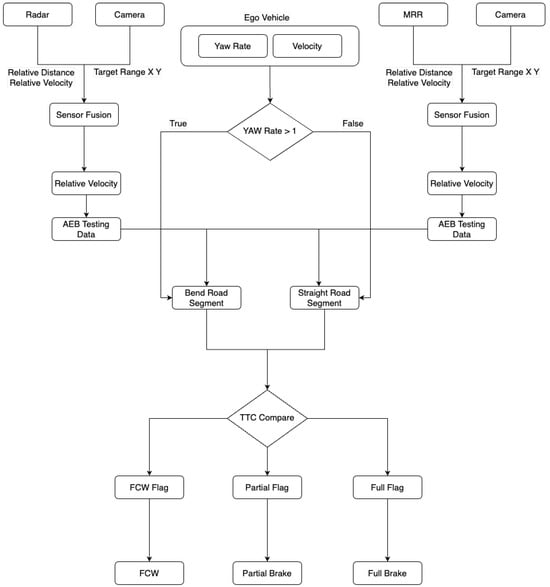 Additionally, Ref. [15] describes the implementation of an AEB system that employs fuzzy logic to recognize and predict traffic light statuses, facilitating autonomous decision-making and the application of various control algorithms. Other studies primarily focus on system simulations and operational mechanisms.
