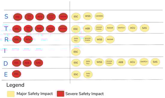 The threat and risk assessment (TARA) phase aimed to identify and analyze the vulnerabilities of the AEB system and evaluate the risks associated with each identified threat. Initially, the selected architecture components and their interconnections were input into the Medini tool, which automatically generated a list of relevant threats.