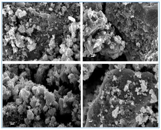 SEM images of TiO2 synthesized at 70 °C ((A) uncalcined sample, (B) calcined at 400 °C, (C) calcined at 500 °C, and (D) calcined at 600 °C).