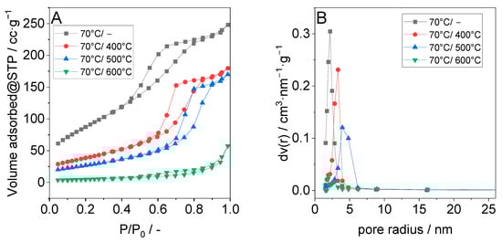 N2-sorption isotherms for pristine TiO2 synthesized at 70 °C as well as for materials obtained after calcination at different temperatures are presented in Figure 3A, and their pore radius distribution is shown in Figure 3B. The N2-sorption isotherms of the uncalcined sample and that of the material calcined at temperatures up to 500 °C can be classified as type IV with an H3 hysteresis loop, which indicates the presence of mesopores [26,27]. The adsorption isotherm shifts to areas of higher relative pressure with increasing calcination temperature, indicating the formation of larger pores with increasing temperature [28]. On the other hand, the absence of the hysteresis loop in the adsorption isotherms of the sample calcined at 600 °C indicates that the TiO2 has almost completely lost its mesoporosity at this temperature. The derived BET surface areas (ABET), pore volumes (Vp), and pore size maxima (Sp) are summarized in Table 2. A relatively high BET surface area of about 300 m2·g−1 was measured for the uncalcined sample [29]. As expected, BET surface area and pore volume significantly decreased when the material was calcined. Interestingly, the BET surface area of the TiO2 sample calcined at 500 °C was still two times higher in comparison to the BET surface area of P25 [30].