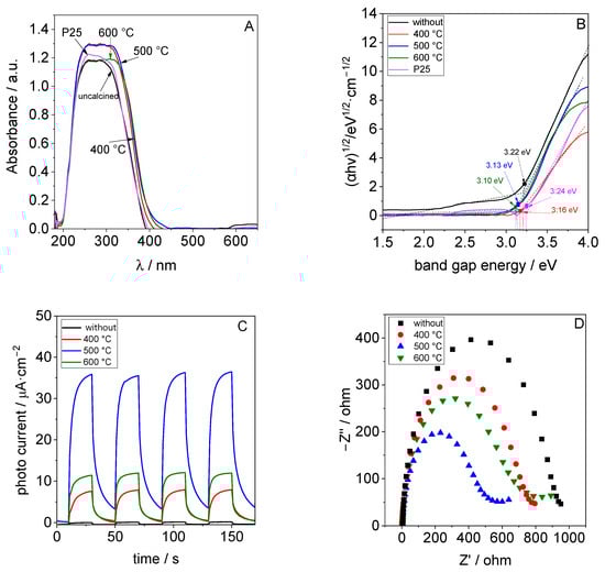 (A) UV-Vis DR spectra of TiO2 synthesized at 70 °C and after calcination at 400 °C, 500 °C or 600 °C and (B) the corresponding Tauc plots for band gap estimation, (C) their photocurrent under irradiation with light (λ = 365 nm), and (D) the corresponding EIS results.