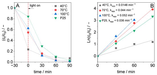 The uncalcined TiO2 samples showed both DCF adsorption and photocatalytic degradation (cf. Figure 5A). When the TiO2 was synthesized at 40 °C, about 75% of DCF was adsorbed within 30 min in the dark, but DCF adsorption dropped significantly when the synthesis temperature was raised to 70 °C or 100 °C. The reasons for the higher DCF adsorption of the material synthesized at 40 °C might be a high content of amorphous titanium dioxide, a low crystallinity of the TiO2 phase, and a high carbon content. A negative effect of the presence of an amorphous TiO2 phase on the photocatalytic activity has been already reported [33]. The photocatalytic DCF degradation activity of the samples synthesized at 70 °C or 100 °C is similar to that of P25, which also shows lower adsorption of DCF in the dark. The pseudo-first-order rate constant for photocatalytic DCF degradation estimated from a plot of ln(c0·ct−1) versus reaction time is presented in Figure 5B. The rate constant of DCF degradation increases with increasing sol–gel synthesis temperature, and for TiO2 synthesized at 70 °C and 100 °C, the estimated degradation rate constant was slightly higher than the rate constant obtained when using P25 TiO2 as the photocatalyst.