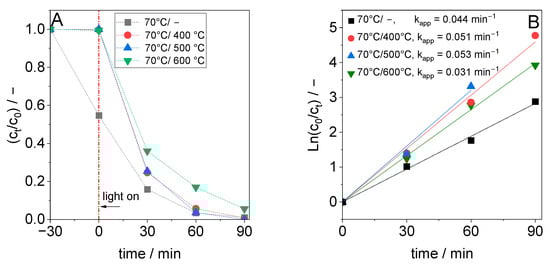 (A) Plot of relative DCF concentration versus time for TiO2 synthesized at 70 °C and of samples calcined at 400 °C, 500 °C or 600 °C and (B) plot for the estimation of the pseudo-first-order rate constant (for B: c0 = DCF concentration when turning on the light).