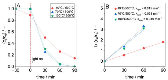 Figure 7 compares the photocatalytic performance of materials synthesized at different temperatures but calcined under identical conditions at 500 °C. TiO2 samples synthesized at 70 °C or 100 °C exhibit higher activity after calcination than the sample synthesized at 40 °C. This confirmed that the formed TiO2 phase is only one of the factors responsible for the photocatalytic activity.