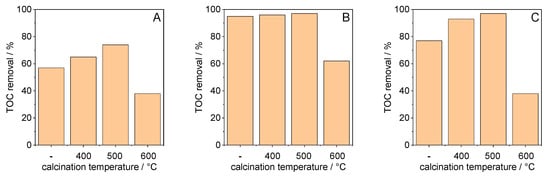 Effect of calcination temperature on TOC removal for TiO2 synthesized at (A) 40 °C, (B) 70 °C, and (C) 100 °C (‘-’ = without calcination, TOC values were determined after irradiation of 120 min).