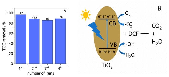 (A) Results of the reusability test for DFC degradation and (B) the proposed mechanism for DCF degradation using TiO2 under irradiation with simulated sunlight.