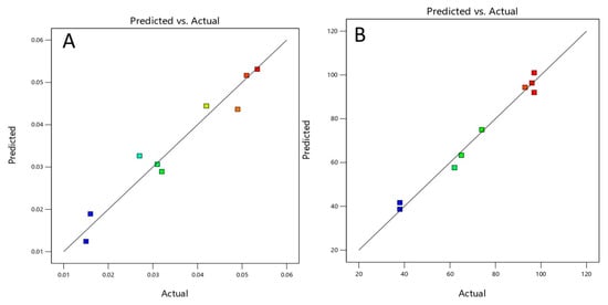 In this section, statistical methods are applied to find the optimal synthesis parameters leading to a TiO2 photocatalyst with the highest performance regarding DCF decay and mineralization. Using the optimal custom design model Version 13.0.5.0, the synthesis temperature and the calcination temperature were used as input variables (A) and (B), respectively. Four different models were applied, but only the quadratic model fit the pseudo-first-order DCF degradation rate and TOC removal, as shown in Tables S1 and S2, respectively. Statistic parameters obtained from data fitting for the quadratic model are summarized in Table 3. For the pseudo-first-order DCF degradation rate, the predicted R2 (0.440) is relatively low compared to the adjusted R2 of 0.877, i.e., the difference is greater than 0.2. Such a difference might result from large block effects [37]. The Adeq precision value (10.101), which measures the signal to noise ratio, is higher than 4, indicating an adequate signal [37]. For TOC removal, the predicted R2 of 0.831 is still in reasonable agreement with the adjusted R2 of 0.955, i.e., the difference is less than 0.2, the Adeq precision value (the signal to noise ratio) is 14.846, indicating an adequate signal for this parameter as well. The statistic parameters indicate that the quadratic model can predict both parameters inside the chosen region.