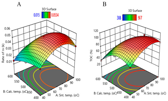 The obtained quadratic equations for the pseudo-first-order rate constant and TOC removal are presented in Equations (9) and (10). A comparison between the experimental and predicted values obtained with these equations is presented in Table 4. The quadratic equation fits TOC removal better than the first-order DCF degradation rate constant, as shown in Figure 10 (A = synthesis temperature; B = calcination temperature). The reason for the poorer fitting of the rate constant could be that the number of collected data points was too small to determine the rate constant with the required accuracy. However, a compromise usually must be found between the required experimental effort and the quality of the experimental results. Tables S3 and S4 show that not all factors in Equations (9) and (10) have the same significance. In both models, the factor AB shows the lowest significance, whereas, in general, the significance of the factors for the equation describing the TOC removal is higher.