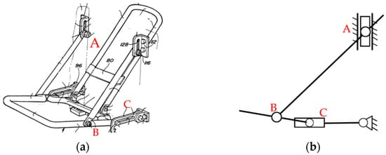 The patent entitled child restraint seat: (a) patent scheme; (b) kinematic diagram of a central and guide sliding crank-type mechanism (A, B and C are reference points).