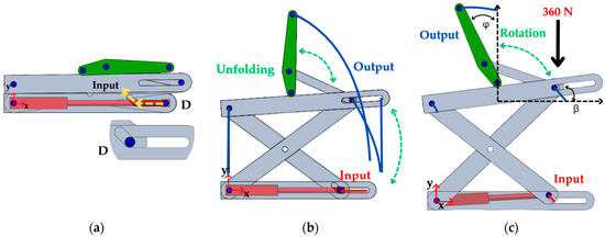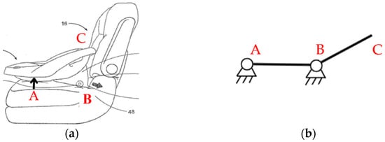 The input is the motion of the linear actuator, and the outputs are the unfolding movements of links and and the trajectory of B and C points, as shown in blue in Figure 13c. Each link is shown moved when the seat mechanism unfolds and rotates, as shown in Figure 13c.