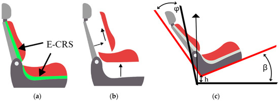 Scheme of the displacements required for the mechanism: (a) scheme on the position of the car seat mechanism for a child restraint system; (b) lifting of the seat and backrest; (c) seat rotation reaction to unexpected and expected situations.